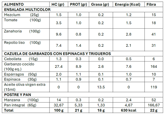 El contenido de fibra de este menú es de 19,4 gr, que se aproxima a las recomendaciones diarias de fibra (25 – 30 gr).