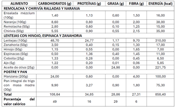 El menú propuesto consiste en un primer plato de remolacha y chirivía ralladas y naranja, un segundo plato de lentejas con hinojo, espinaca y zanahoria, una manzana como postre, y una ración de pan integral de trigo. Una ración estándar de este menú aporta 858,4 kcal (42,9% de un plan alimentario de 2000 kcal/día). Además de ser un menú ecológico que garantiza la sostenibilidad, se trata de un menú equilibrado desde el punto de vista nutricional ya que el porcentaje del valor calórico que representan los carbohidratos, las proteínas y la grasa es de un 49%, 16% y 29%, respectivamente. Además, teniendo en cuenta que la ingesta recomendada de fibra está establecida en 25 g/día, con este menú se lograría cubrir los requerimientos diarios de este nutriente, puesto que una ración del mismo aporta 27,3 gramos de fibra.